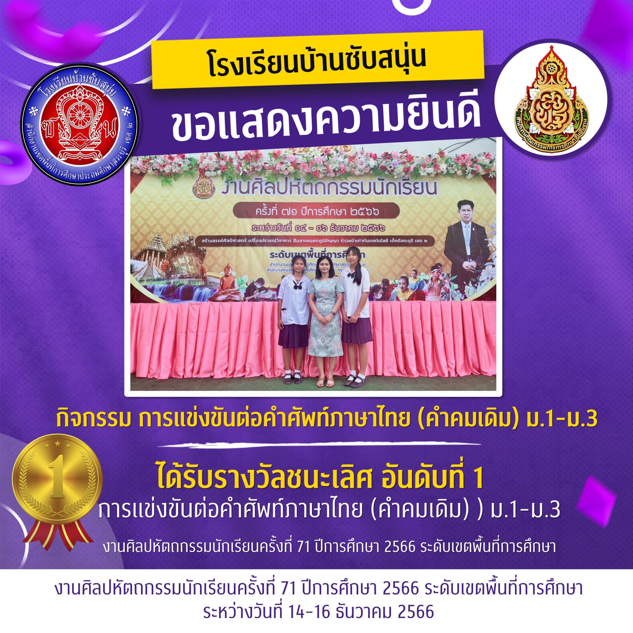 ชนะเลิศการแข่งขันต่อคำศัพท์ภาษาไทย คำคมเดิม ม.1-3 งานศิลปหัตถกรรมนักเรียน ระดับเขตพื้นที่การศึกษา ครั้งที่71 ปีการศึกษา2566