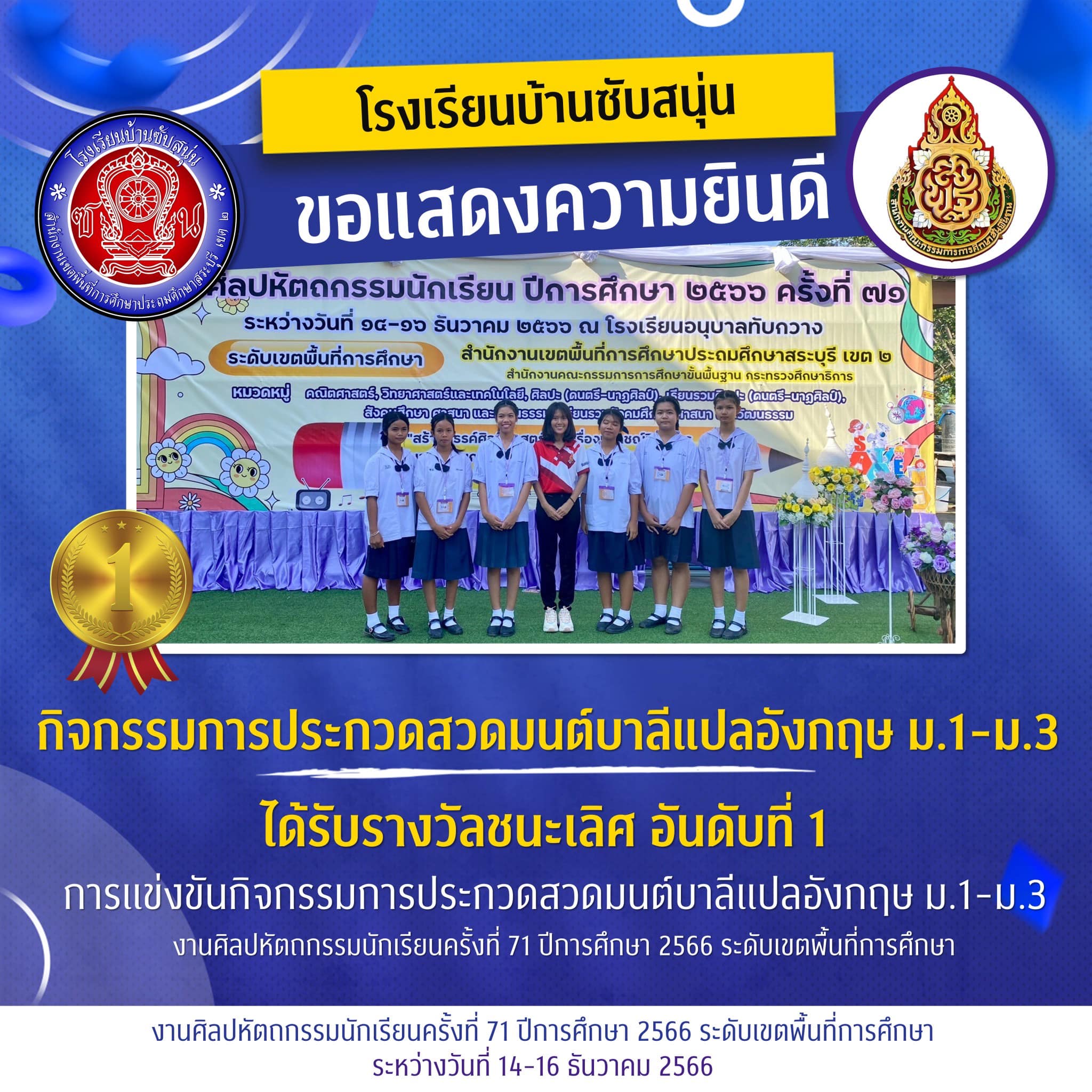 ชนะเลิศการประกวดสวดมนต์บาลีแปลอังกฤษ ม1-3 งานศิลปหัตถกรรมนักเรียน ระดับเขตพื้นที่การศึกษา ครั้งที่71 ปีการศึกษา2566