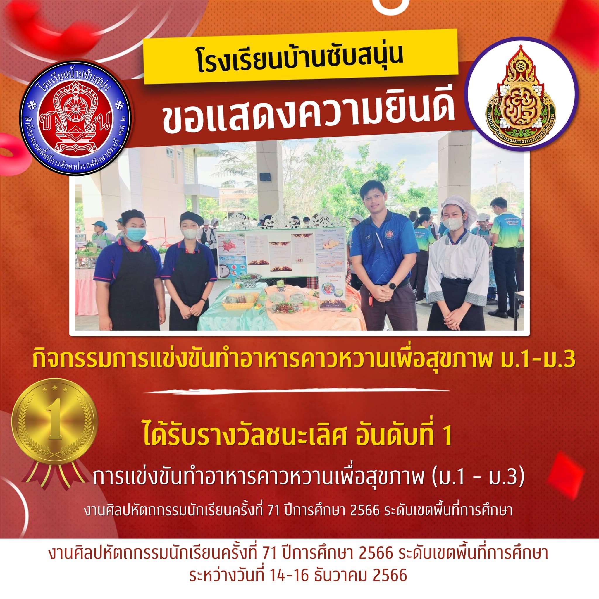 ชนะเลิศการแข่งขันทำอาหารคาวหวานเพื่อสุขภาพ ม1-3 งานศิลปหัตถกรรมนักเรียน ระดับเขตพื้นที่การศึกษา ครั้งที่71 ปีการศึกษา2566